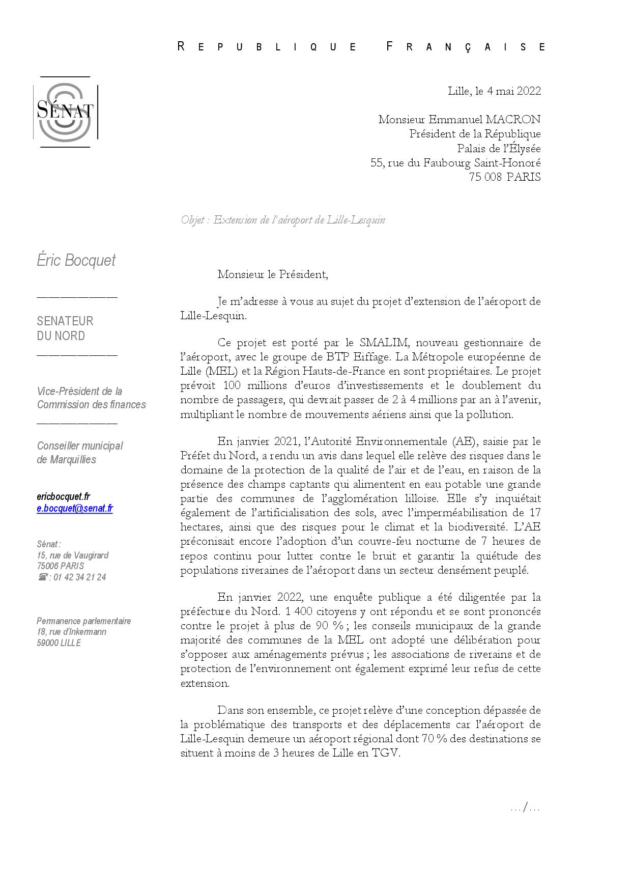 Je m’adresse à vous au sujet du projet d’extension de l’aéroport de Lille-Lesquin.